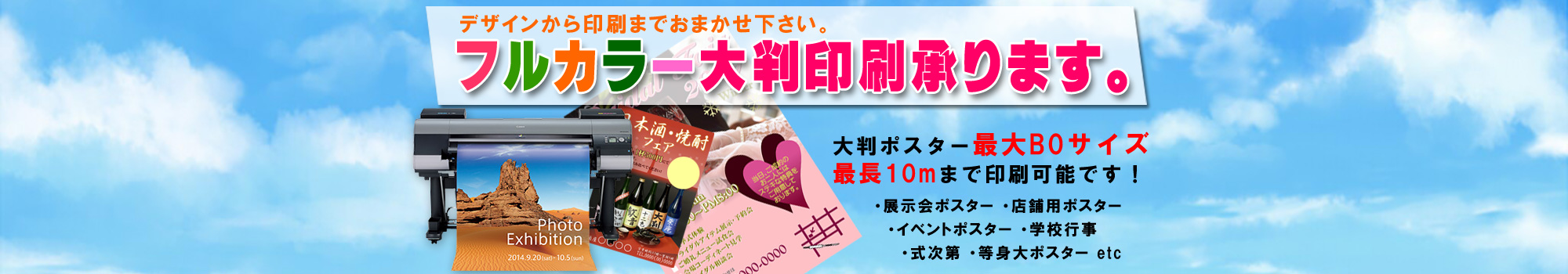 フルカラー大判印刷いたします。最大B0サイズ!最長10mまで印刷可能です。印刷用紙も多種多彩ご用意しています。